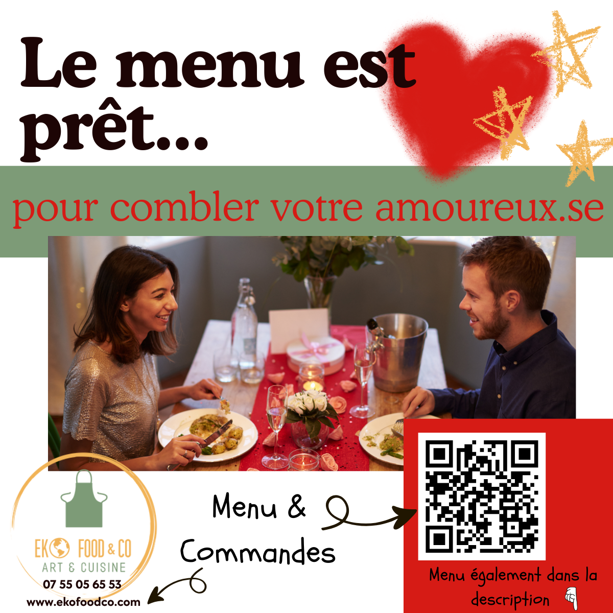 Entrées au choix : Feuilleté de crevettes à la créole et sa salade de chou à la japonaise. Ou Gyoza de bœuf à la coréenne et sa salade de chou à la japonaise. Plats au choix : Médaillons de mignon de cochon sauce champignons et estragon et son risotto au parmesan. Ou Pavé de saumon laqué, riz basmati et son flan de légumes. Dessert : Tiramisu à la framboises. LA DATE ET LE LIEU DE LIVRAISON : le vendredi 13 février entre 18h et 20h au 180 chemin de sous les Clos sur Aubais LE LIEN POUR COMMANDER : https://forms.gle/ovmUope7SUU3HCgt7 #EkoFoodCo #Aubais #SaintValentin #Menus | Et bientôt votre menu de Pâques |
